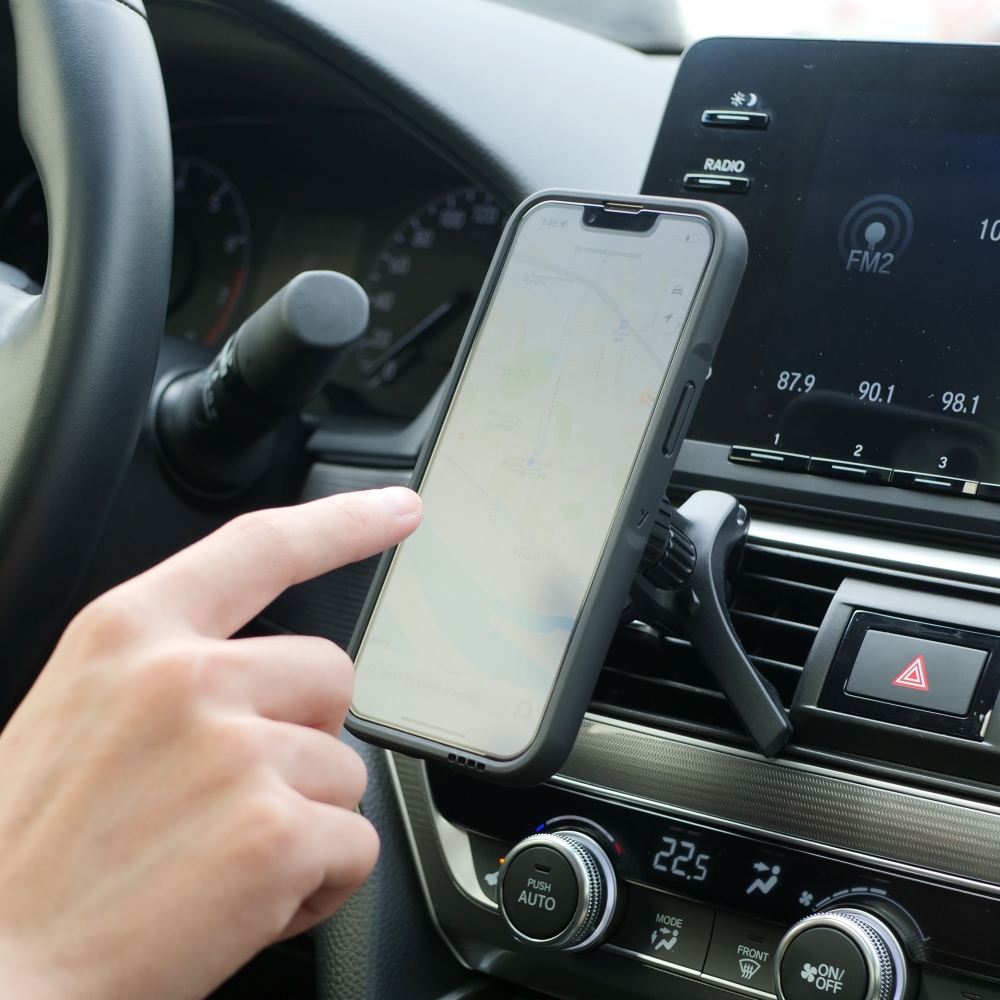 Dodatkowe Chłodzenie: Umieszczenie uchwytu na kratce dodatkowo wspomaga chłodzenie telefonu, zmniejszając ryzyko przegrzania, zwłaszcza podczas dłuższych podróży.