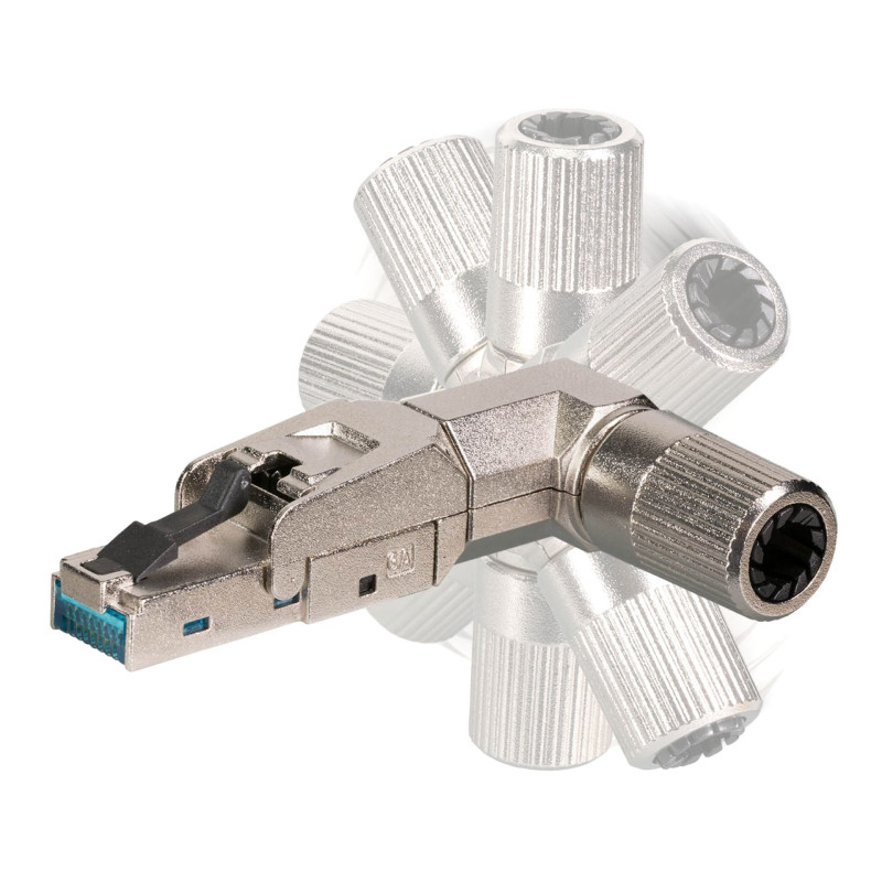 Beznarzędziowy wtyk samozaciskowy kategorii 6a idealnie nadaje się do montażu na kablu sieciowym podczas prac w terenie. Nie wymaga żadnych specjalistycznych narzędzi typu zaciskarka czy narzędzie uderzeniowe Krone. Niezwykle solidna, w pełni metalowa obudowa wykonana z odlewu cynkowego w połączeniu z unikalnym zmiennym dopasowaniem kabla otwiera szeroki zakres możliwości zastosowania. Montaż można przeprowadzić w 9 różnych pozycjach: 8 różnych położeń pod kątem oraz tradycyjne proste doprowadzenie kabla. Stożkowy, metalowy dławik umożliwia stosowanie kabli o średnicy od 6,0 mm do 9,0 mm. Złącze spełnia wymagania klasy transmisji kat. 6A / Class EA i obsługuje protokół Ethernet do 10 Gigabitów na sekundę.