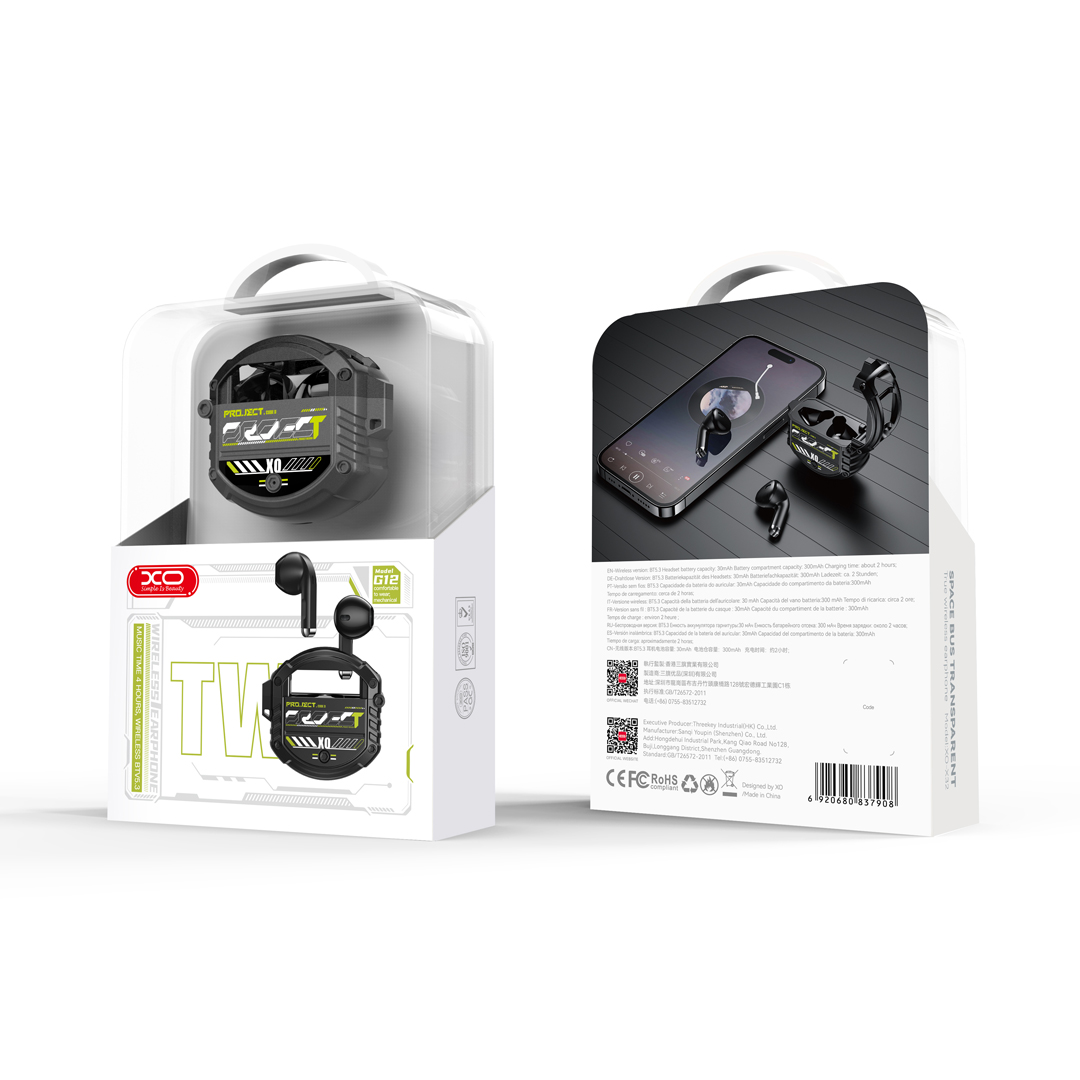 XO G12 to douszne słuchawki bluetooth 5.3 TWS z pudełkiem ładującym. Słuchawki wspierają technologię TWS (True Wireless Stereo) – obie słuchawki łączą się ze sobą tworząc bezprzewodowy zestaw stereo. Przenośne pudełko z wbudowaną baterią oprócz funkcji ładowania pozwala bezpiecznie przechowywać słuchawki w kieszeni, torbie lub plecaku. Uwolnij swoje ręce i słuchaj muzyki, radia internetowego, podczas pracy, spaceru, treningu czy prowadzenia samochodu. Słuchawki XO G12 TWS są idealnym rozwiązaniem dla użytkowników smartfonów, komputerów, notebooków, tabletów i innych urządzeń obsługujących technologię Bluetooth. Są kompatybilne z większością urządzeń z systemem Android oraz iOS. Słuchawki posiadają także mikrofon, dzięki czemu bez problemu możesz prowadzić rozmowy głosowe. Czas trwania rozmów/ słuchania muzyki na pełnym naładowaniu wynosi około 240 minut (w zależności od poziomu głośności), dzięki wykorzystaniu energooszczędnej technologii Bluetooth 5.3.