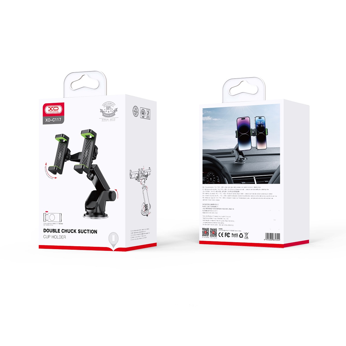 XO C117 to uchwyt samochodowy na dwa smartfony w uniwersalnej wersji na deskę rozdzielczą/ szybę samochodową. Pozwala na dogodne umiejscowienie urządzenia w zasięgu wzroku i rąk kierowcy. Wygoda w użytkowaniu pozwala na szybkie odkładanie i wyciąganie telefonu jedną ręką.